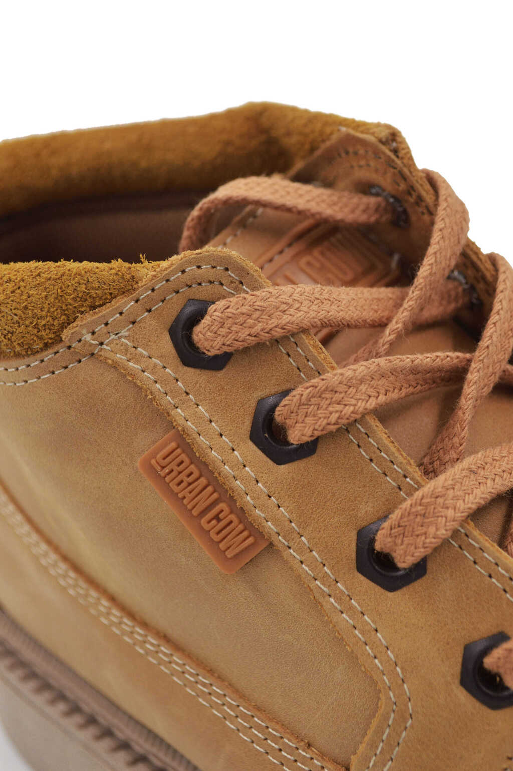 Borcego corto acordonado de cuero vacuno y suela de goma.