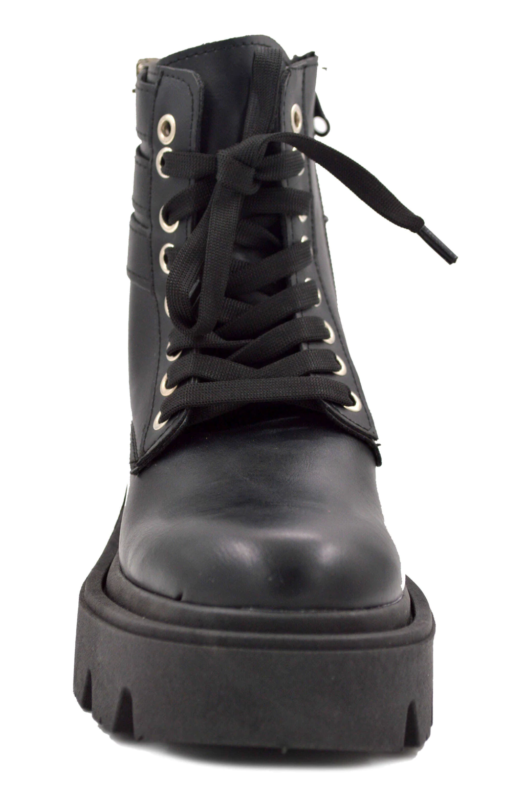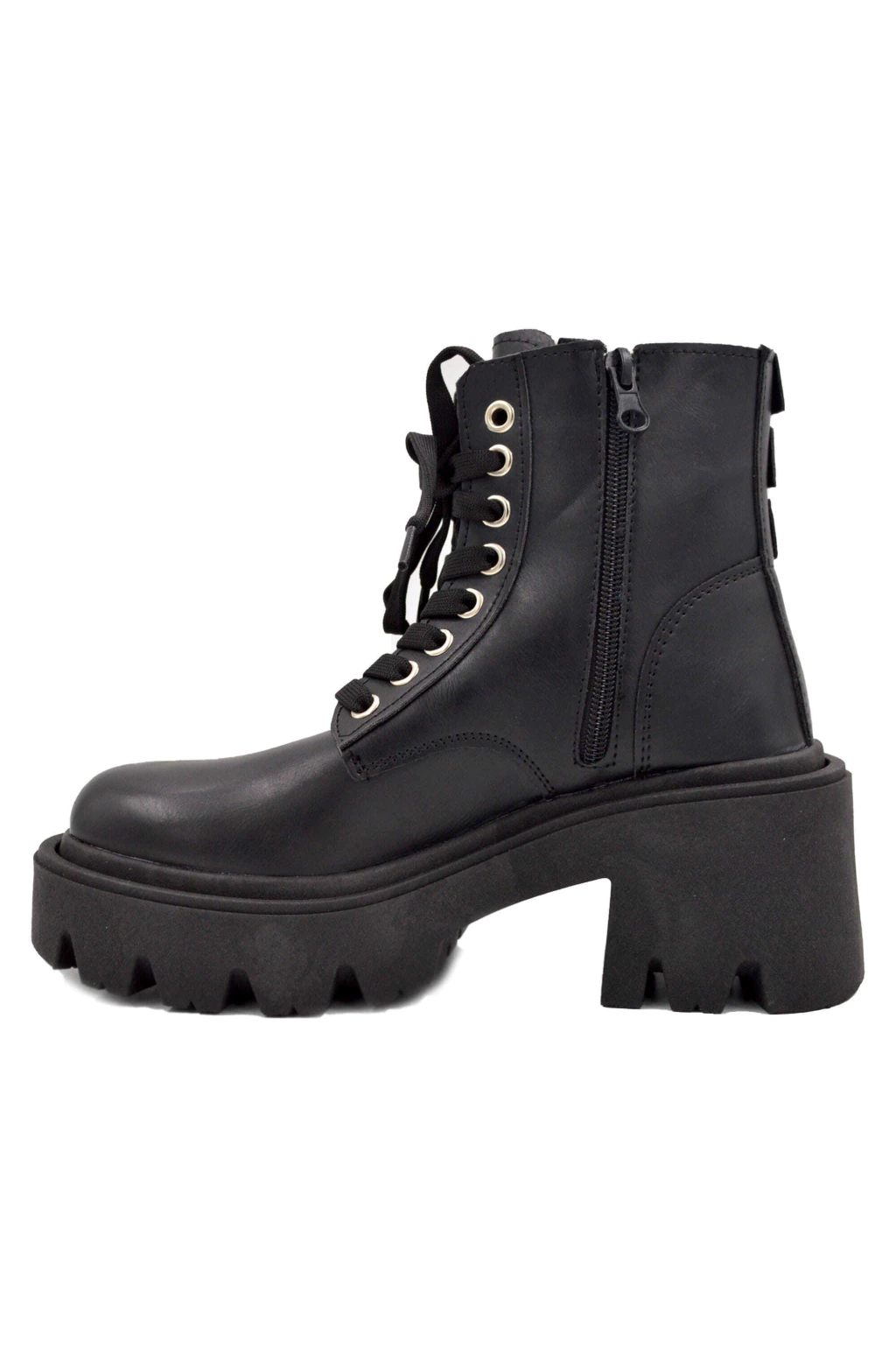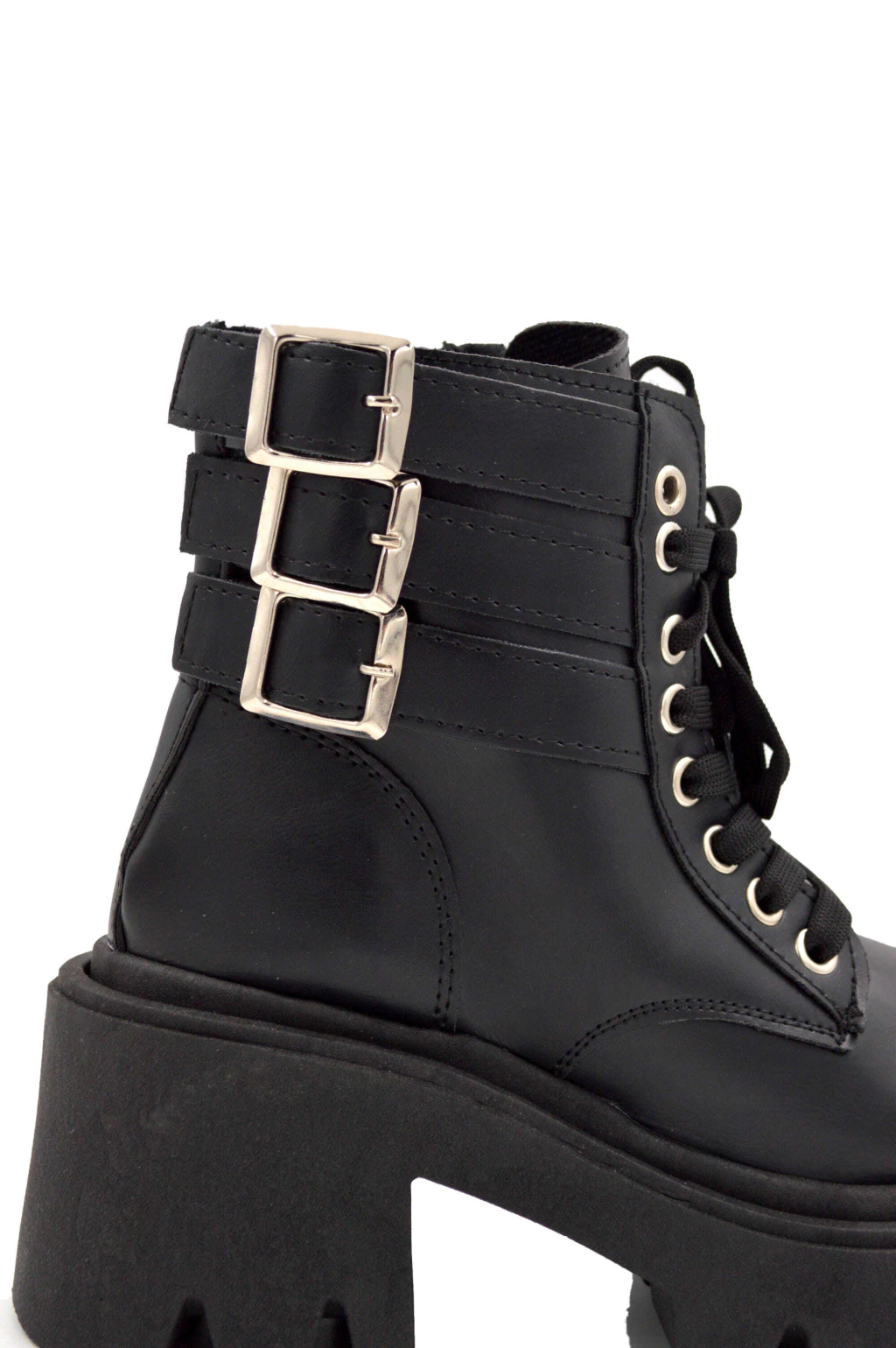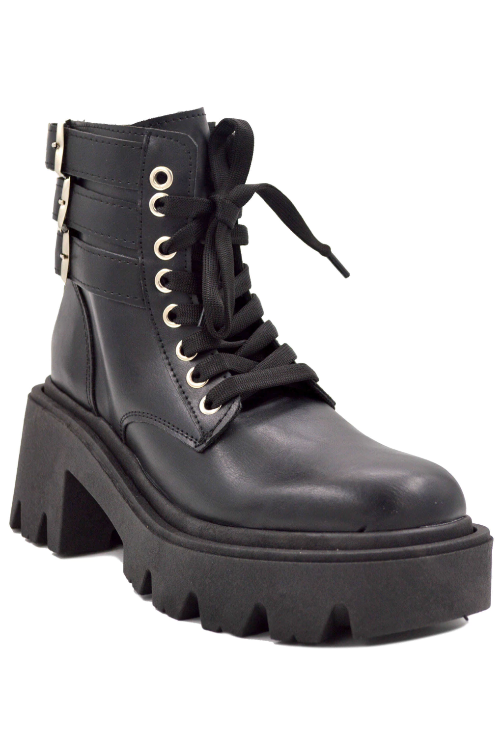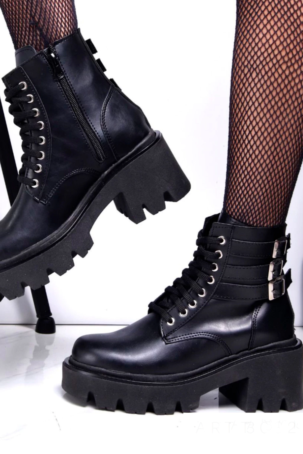 Botas borcego de mujer de cuero vegano. Este diseño con estilo rockero es ideal para sumarle estilo a tus outfits. Poseen 3 hebillas en su lateral externo. Y por su parte interna cuentan con cierre para que su ajuste sea ideal.