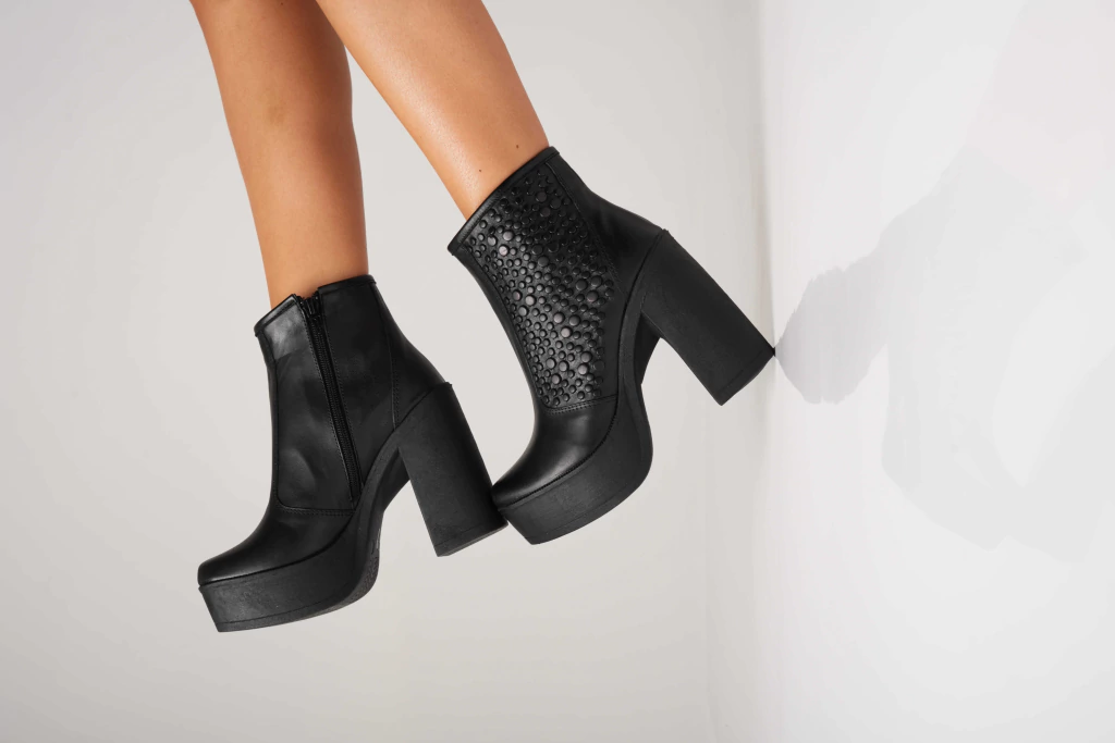 Botas de mujer, de cuero vacuno con plataforma. Combinación de texturas y tachas. Súper cómodas, con cierre lateral interno. Ideales para la noche, combinalas con vestidos, polleras, shorts, pantalones.