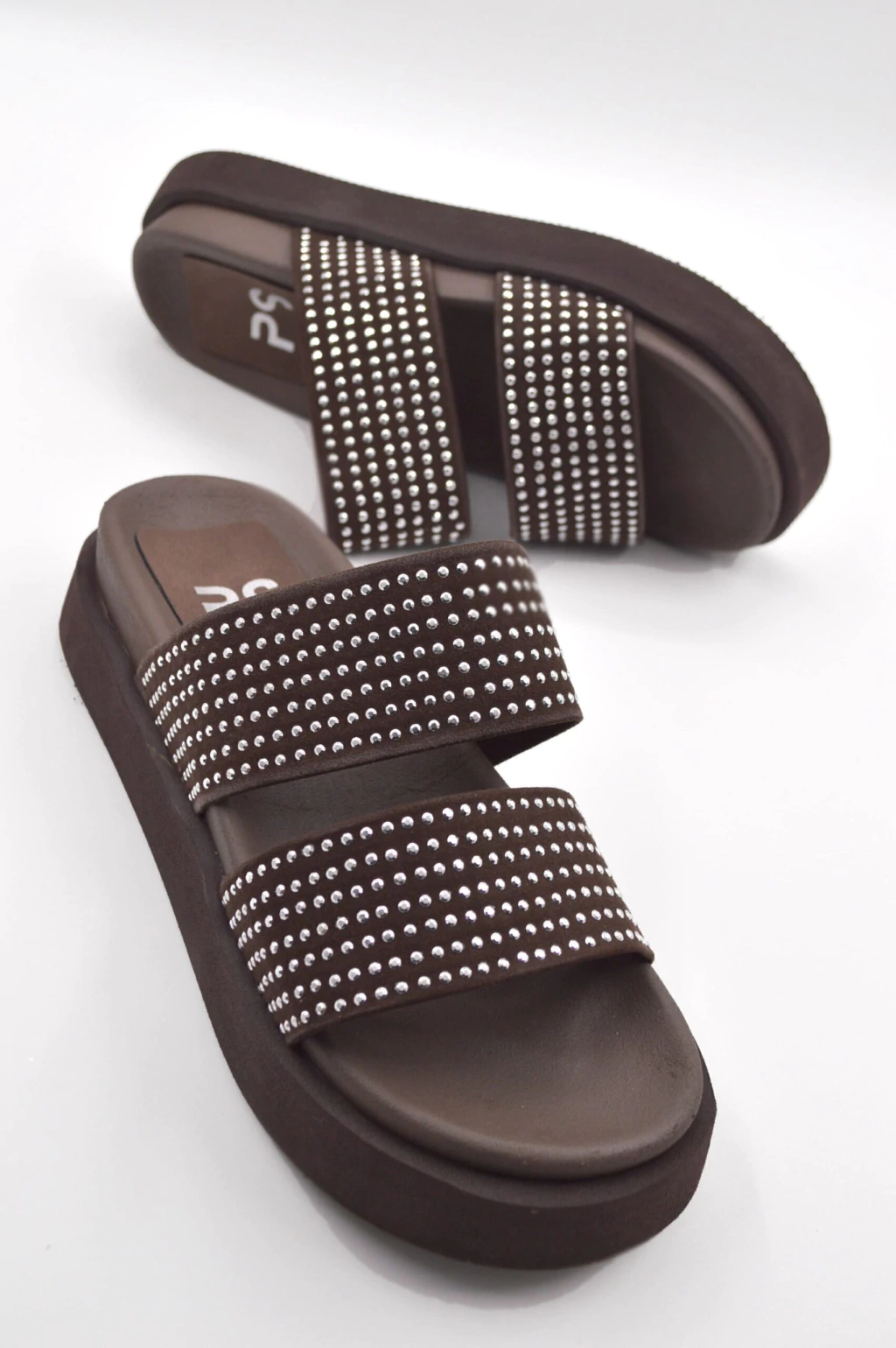 con strass. Gomones con doble tira de tela y brillos. Base de goma eva y taco de 2 cm. Ideal para usar todo el día en toda ocasión. Disponible en colores: negro y suela.
